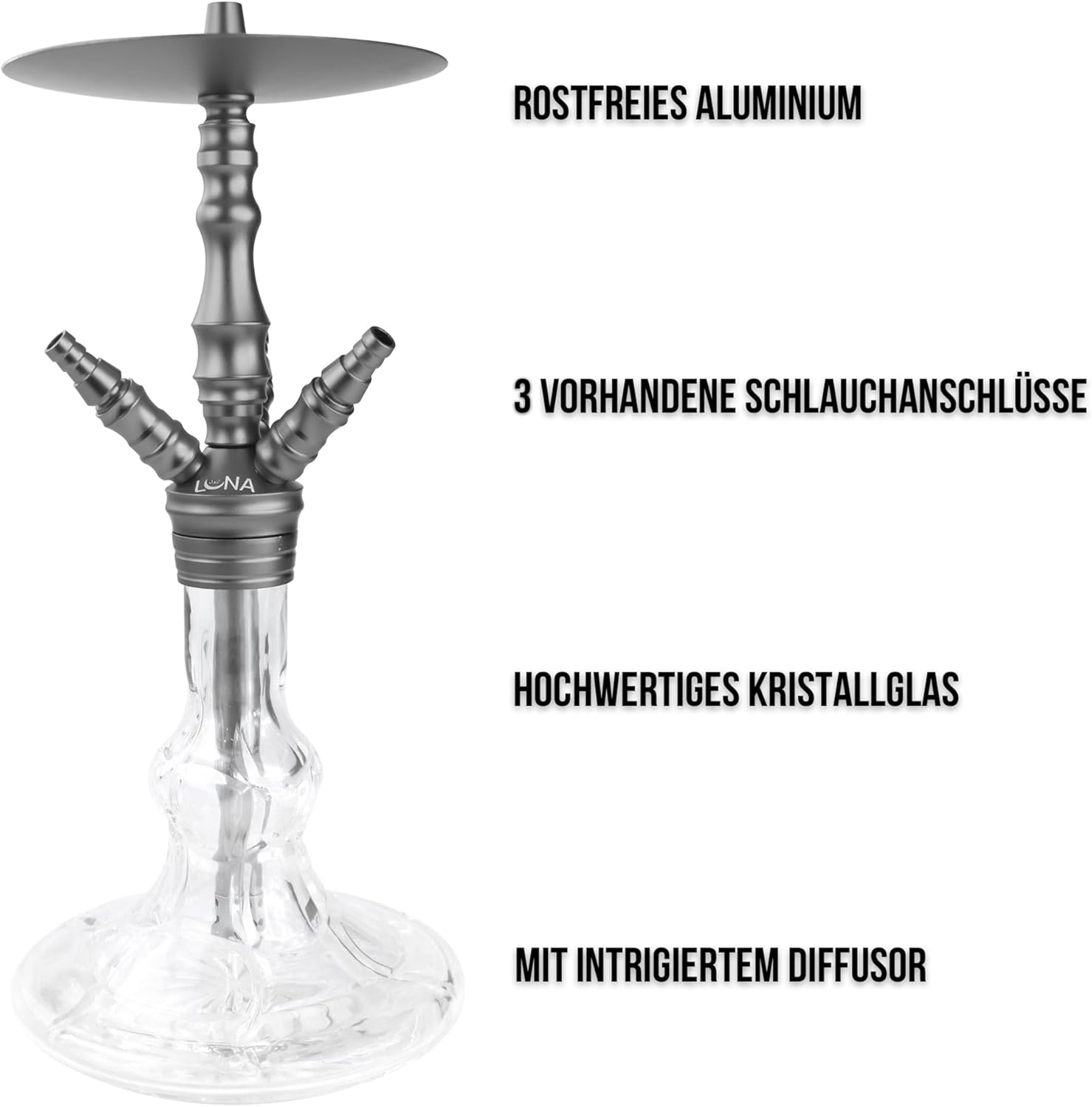Die Luna Minima 2.0 Wasserpfeife ist die perfekte Shisha für deine Reise oder dein Zuhause. Das leichte Material sorgt für sehr bequemes Transportieren. Alle Metallteile sind aus eloxiertem Aluminium. Die Luna Minima 2.0 hat kurze Gewinde an der Bowl und Edelstahl Tauchrohr.