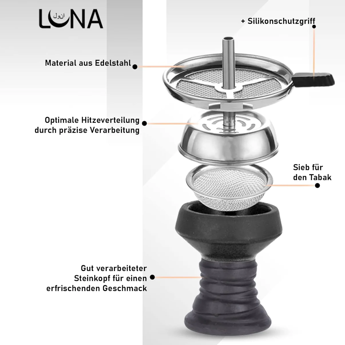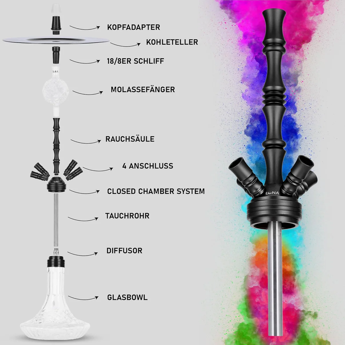 Die Luna Praedo ist wie der Name bereits sagt ein wahrer Zerstörer, die perfekte Shisha für Dein Zuhause. Die Luna Praedo 2.0 besteht aus hochwertigem, rostfreiem eloxiertem Aluminium.